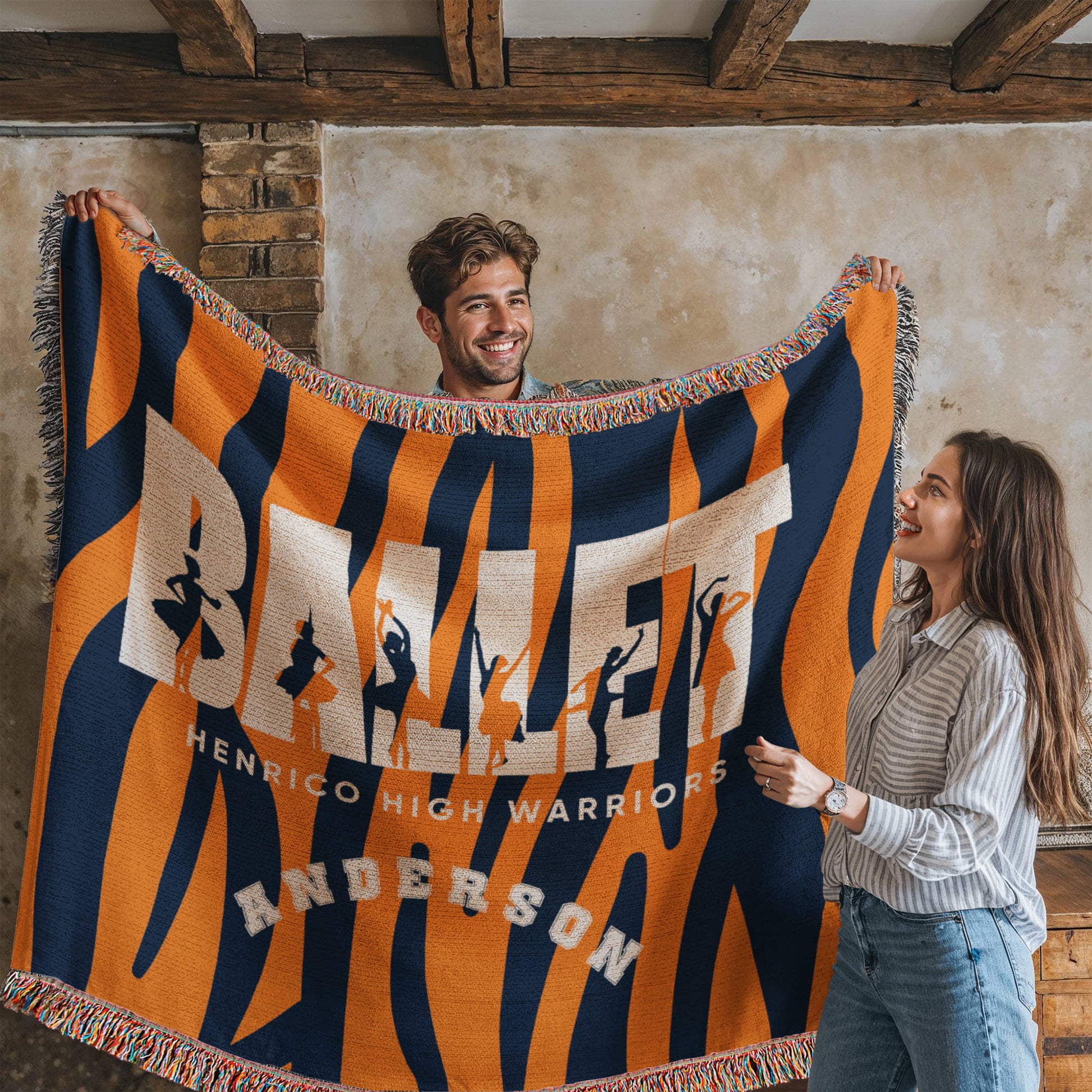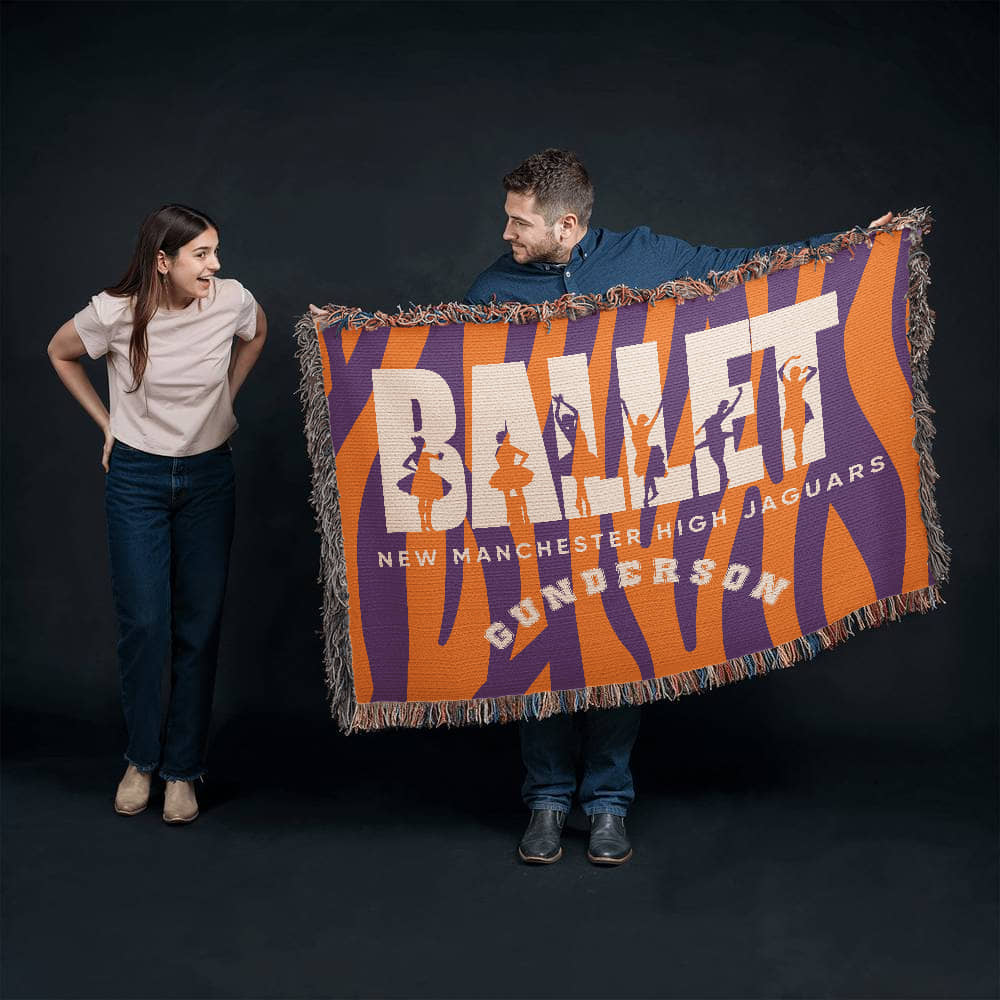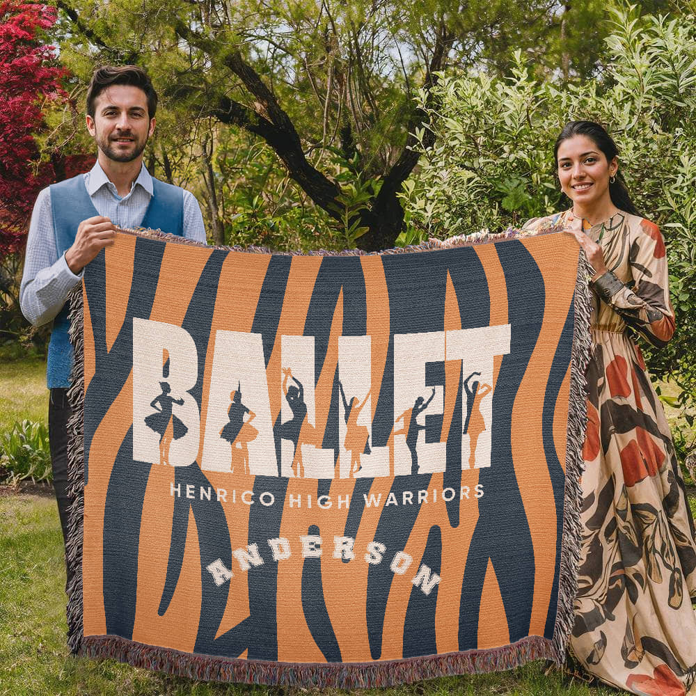 Celebrate poise, passion, and perfect lines with this Personalized Ballet Woven Blanket Throw. Featuring the word “BALLET” filled with silhouettes of ballerinas in elegant poses and dramatic motion, this design captures the soul of the stage. Add your last name and dance studio, school, or team name to create a heartfelt keepsake for the dancer in your life.