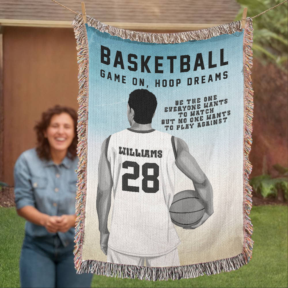 Get ready for tip-off with our Personalized Basketball Woven Blanket – a bold tribute to dedication, drive, and hoop dreams. Whether it's a young athlete chasing glory or a fan who lives for the game, this dynamic blanket captures the spirit of basketball. Featuring a back-view silhouette of a player holding a ball, it proudly displays two inspiring quotes: “Game On, Hoop Dreams” and “Be the one everyone wants to watch but no one wants to play against.”