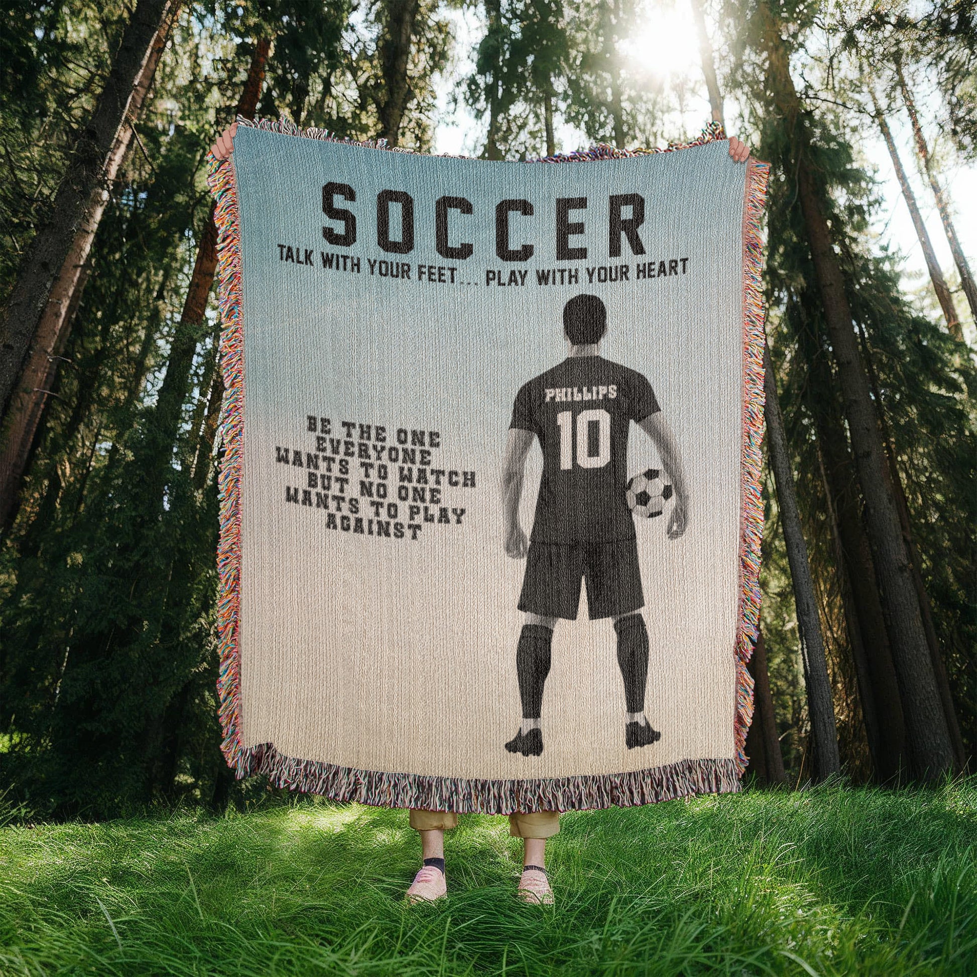 Power, precision, and passion collide on the pitch—and now on this Personalized Boys Soccer Woven Blanket. Showcasing a determined young athlete with a ball in hand, this design features two standout quotes: “Talk with your feet… Play with your heart” and “Be the one everyone wants to watch but no one wants to play against.”