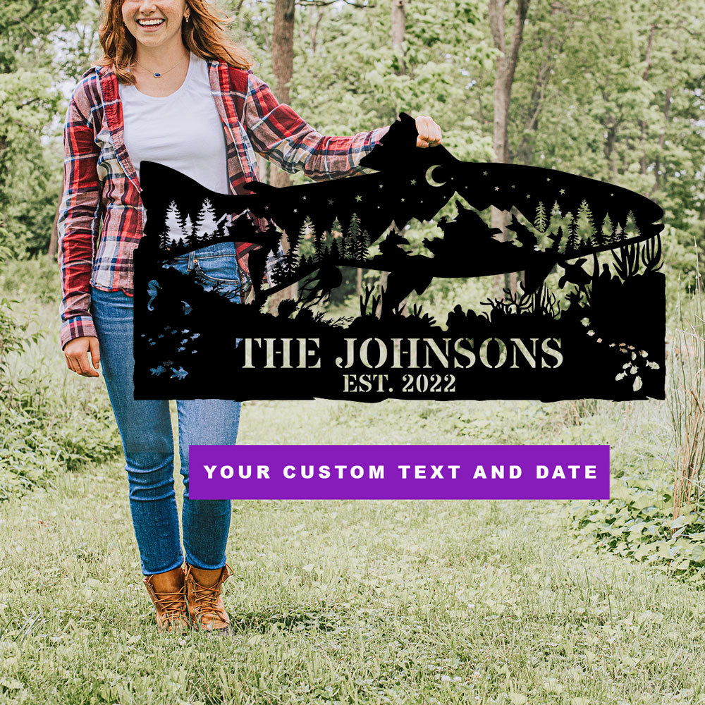Custom Trout and Mountains Landscape Metal Wall Art. Personalized with your Custom text. Trout with a customizable name is perfect for your home or business or a perfect gift.