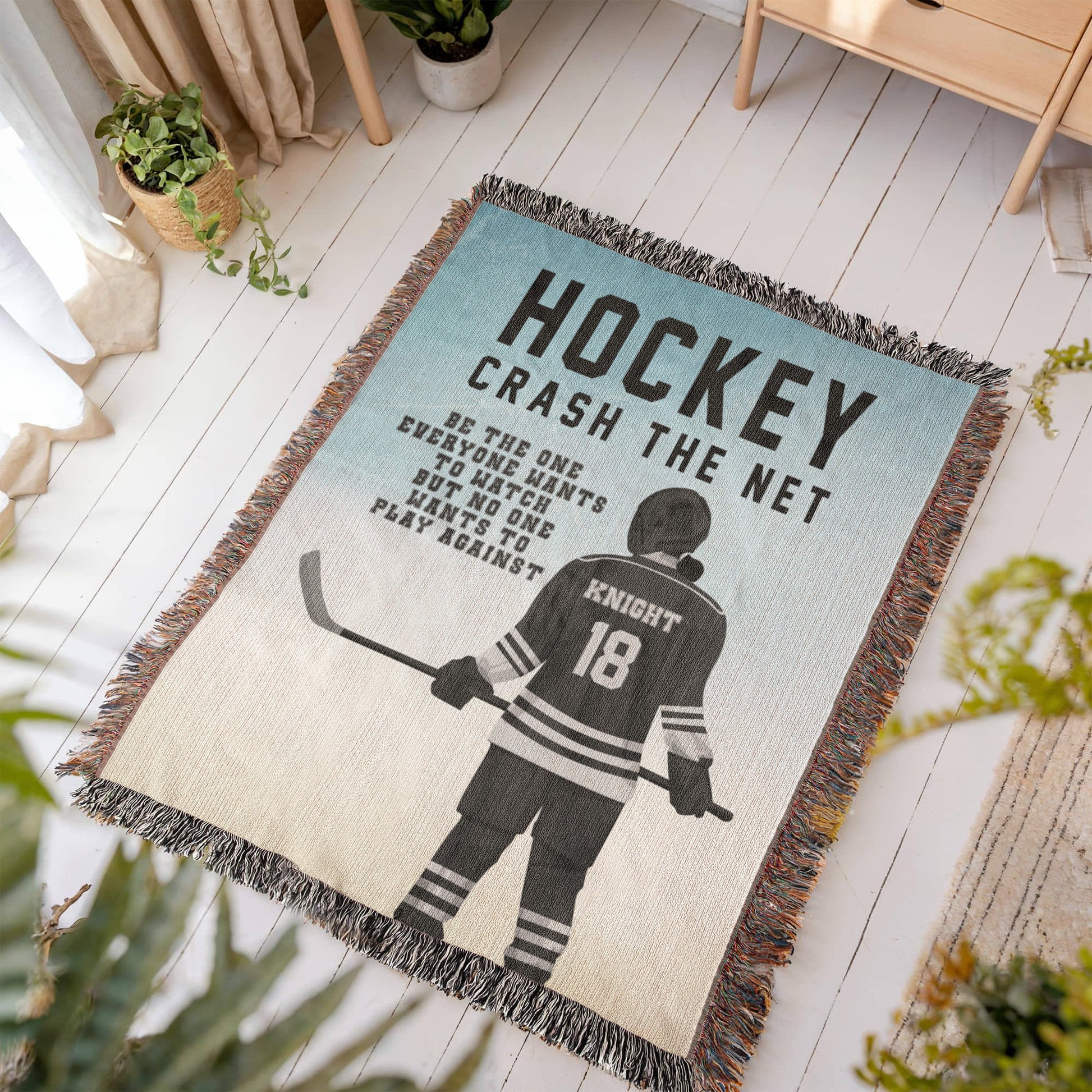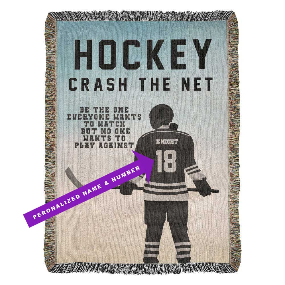 Fierce. Focused. Fearless. Our Personalized Girls Hockey Woven Blanket honors the grit and grace of every girl who crashes the net and leaves it all on the ice. This bold design showcases a powerful player in full gear, backed by the empowering phrases: “Crash the Net” and “Be the one everyone wants to watch but no one wants to play against.”