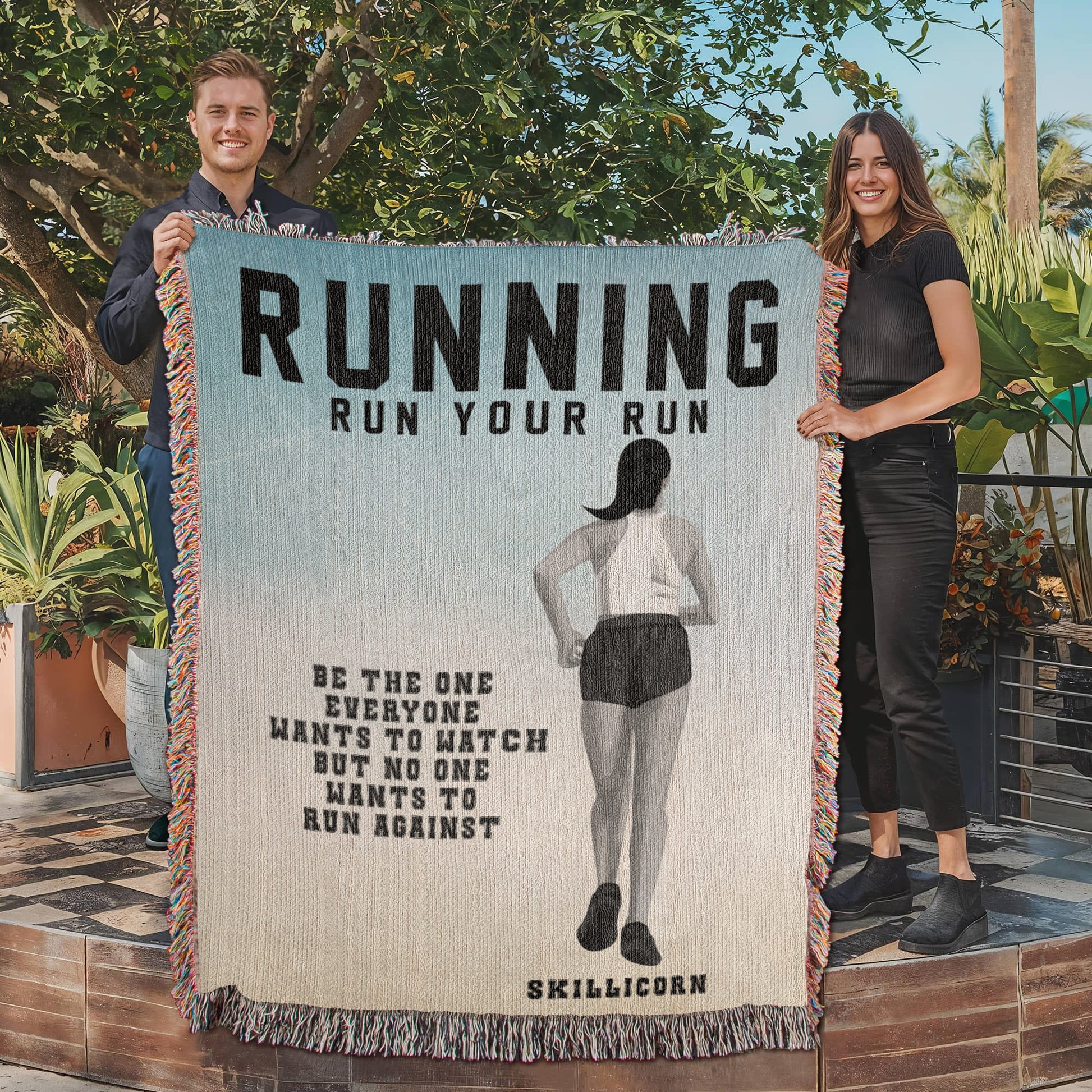 She runs with heart, discipline, and unstoppable drive. Our Personalized Girls Running Woven Blanket celebrates every mile she’s conquered and every finish line still ahead. Featuring a confident runner mid-stride, this design includes two motivating phrases: “Run Your Run” and “Be the one everyone wants to watch but no one wants to run against.”