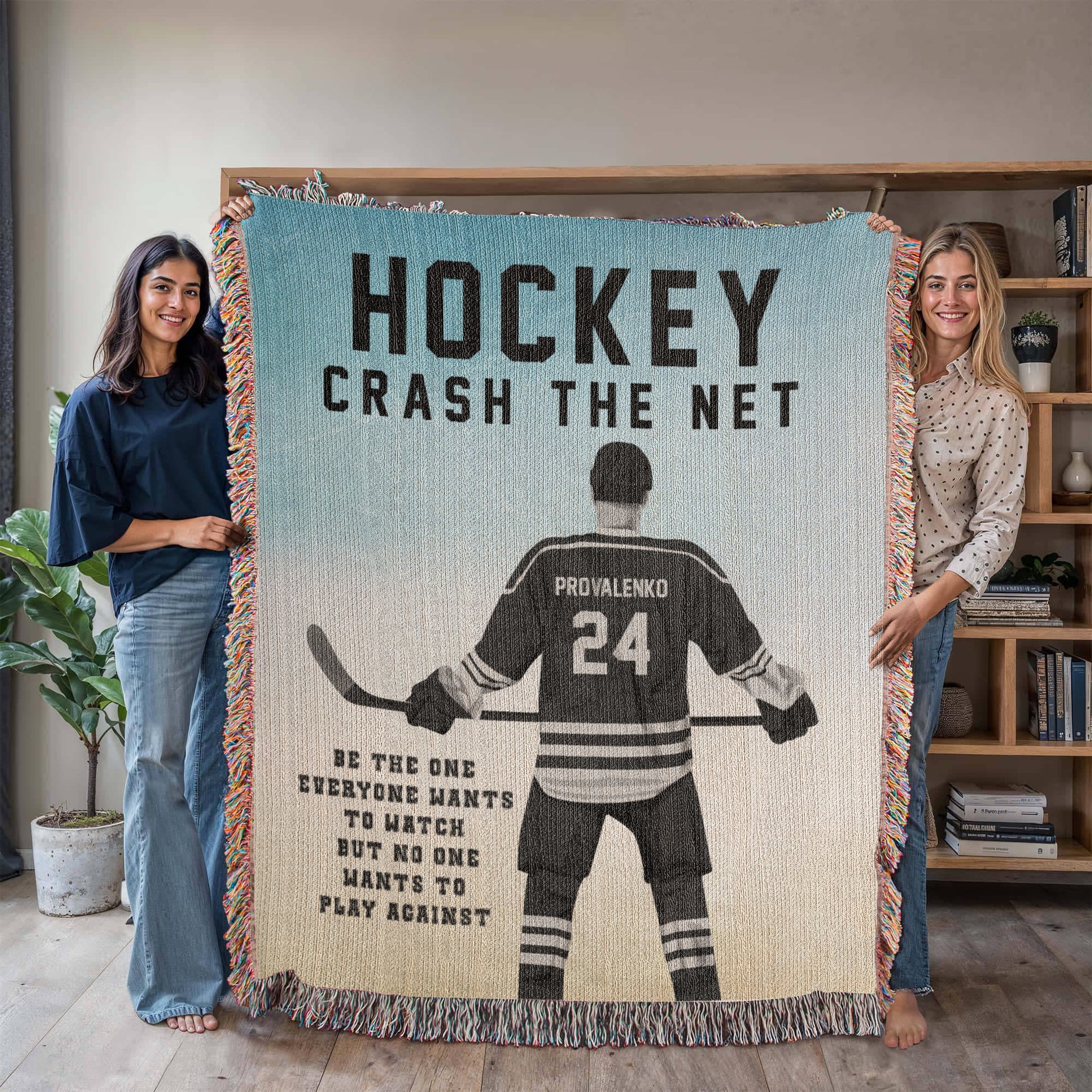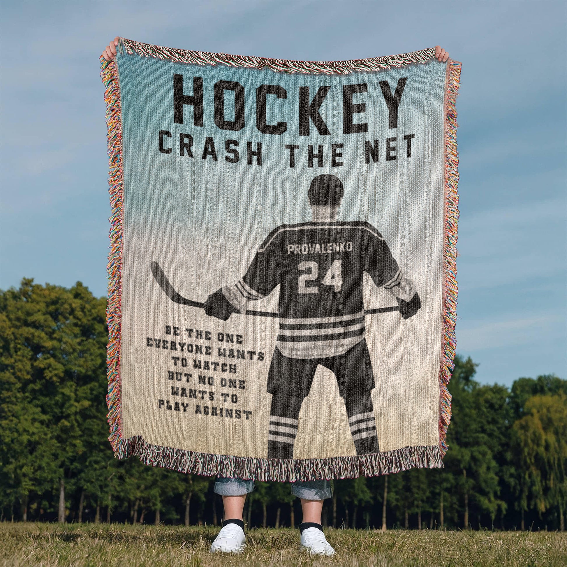 Celebrate the grit, power, and ice-cold focus of hockey with our Personalized Hockey Woven Blanket. Featuring a determined skater ready to take the rink, this design inspires greatness with two bold quotes: “Crash the Net” and “Be the one everyone wants to watch but no one wants to play against.”