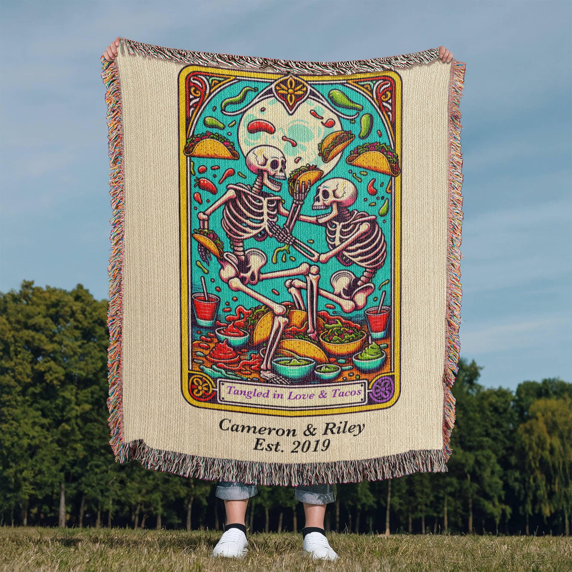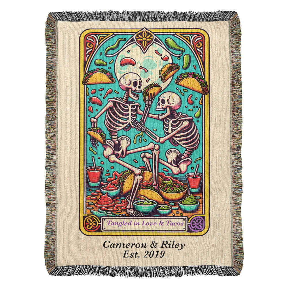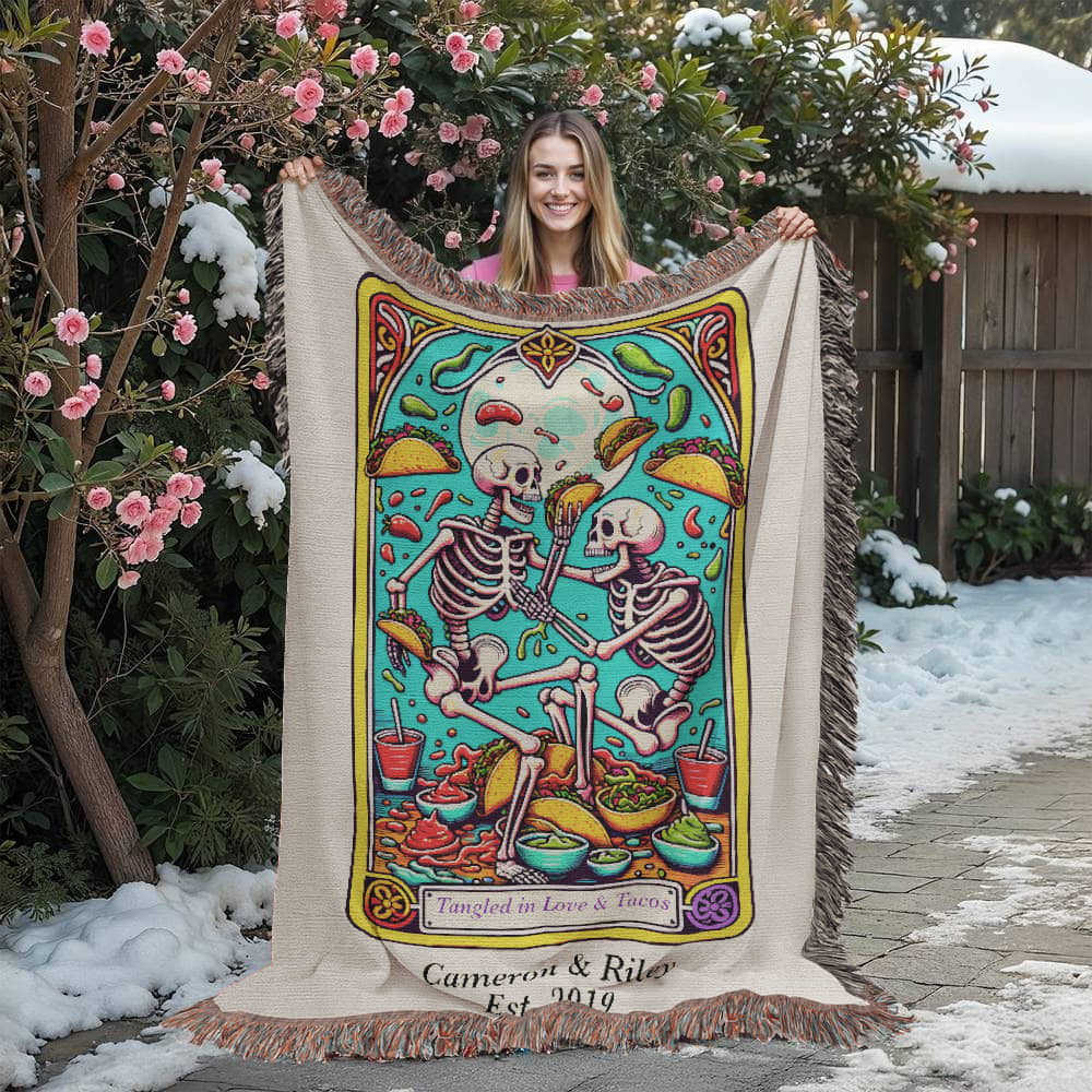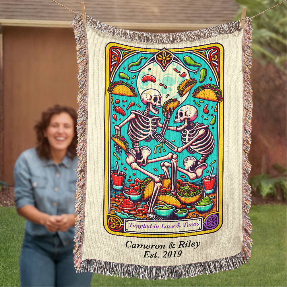 Spice up your love life (and your couch) with this Personalized “Love and Tacos” Tarot Card Woven Blanket. Featuring two skeletons locked in an epic taco-fueled tangle, this vibrant, tarot card–inspired design is made for couples who bond over salsa, laughter, and takeout nights.