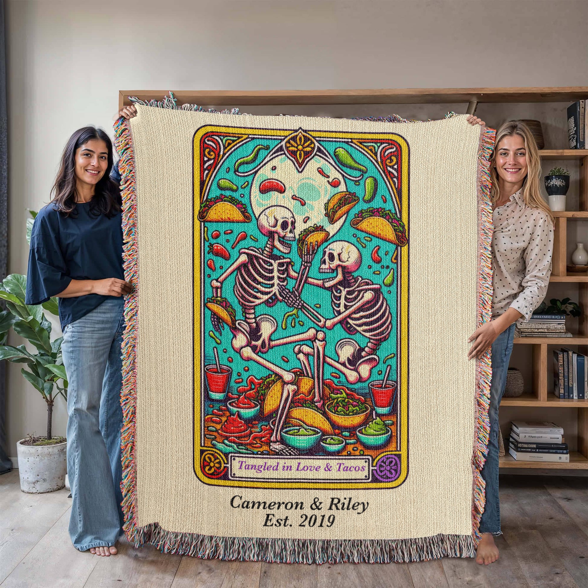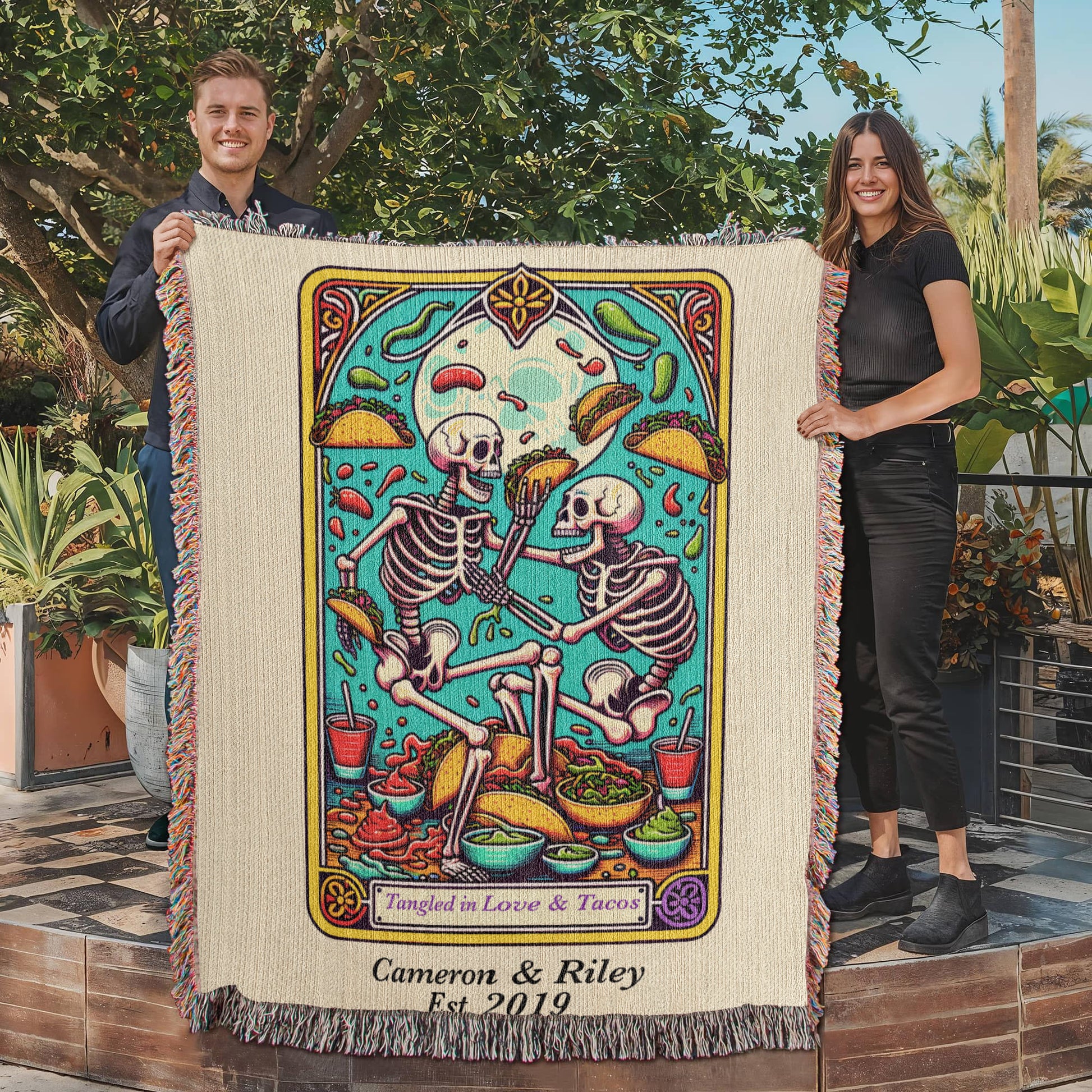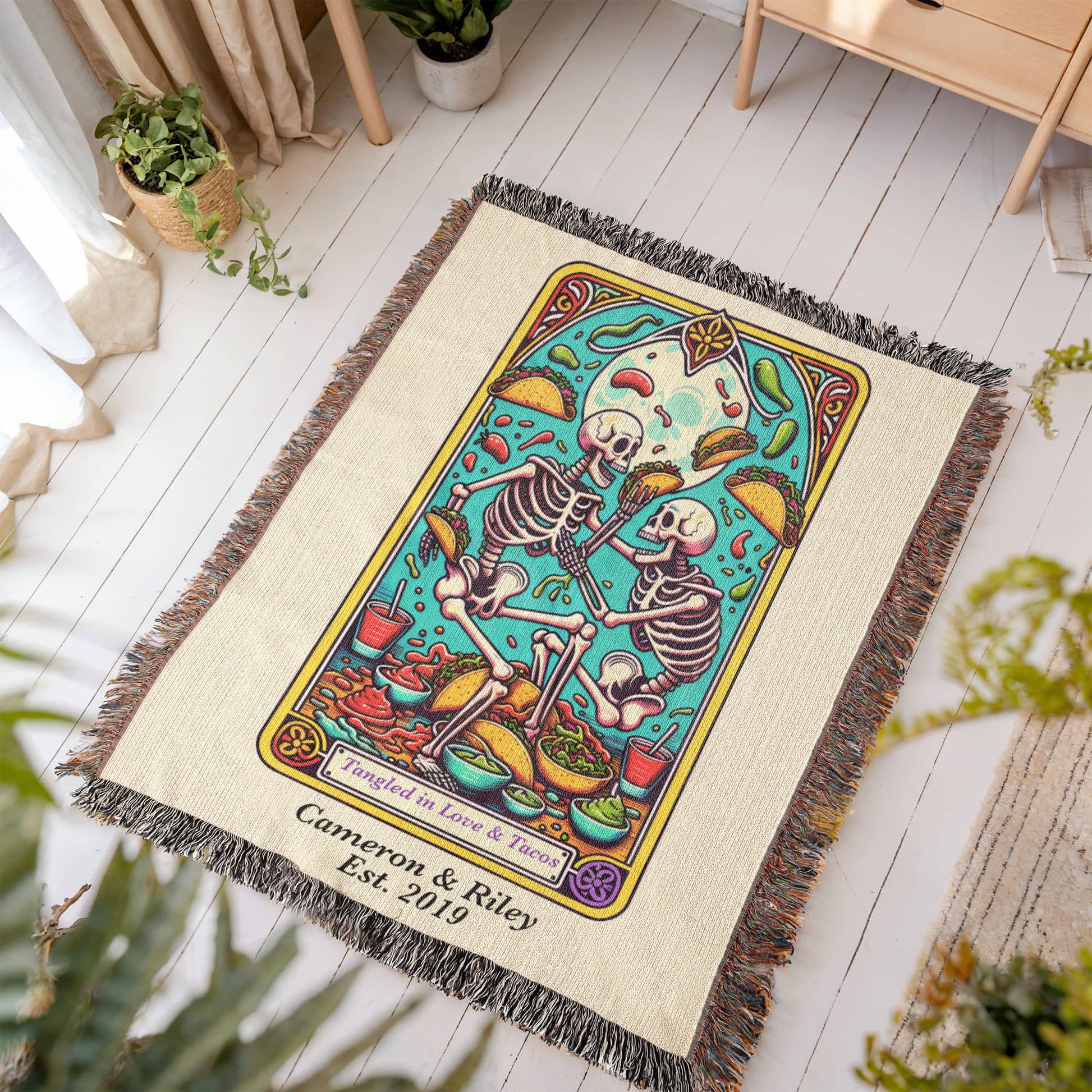 Spice up your love life (and your couch) with this Personalized “Love and Tacos” Tarot Card Woven Blanket. Featuring two skeletons locked in an epic taco-fueled tangle, this vibrant, tarot card–inspired design is made for couples who bond over salsa, laughter, and takeout nights.