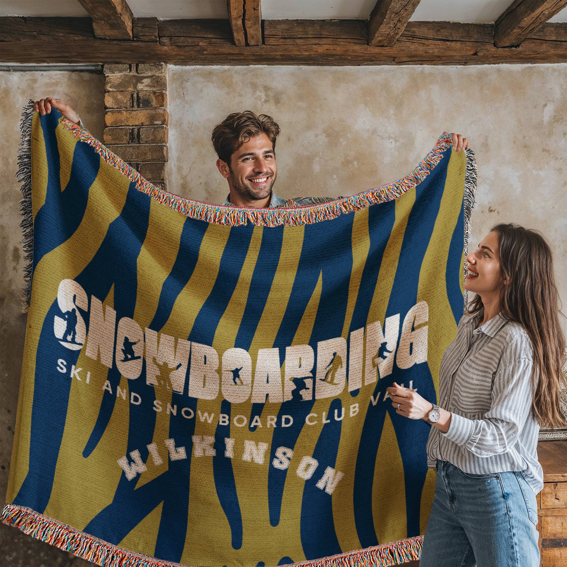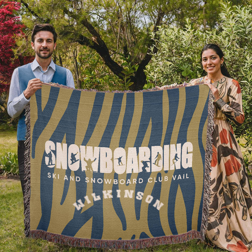 Carve your mark with this bold Personalized Snowboarding Woven Blanket Throw. Featuring powerful silhouettes of snowboarders mid-action embedded within the word “SNOWBOARDING,” this personalized blanket celebrates individuality, skill, and winter sport pride. Customize with the athlete’s last name and school or club name for a gift that shreds in all the right ways.