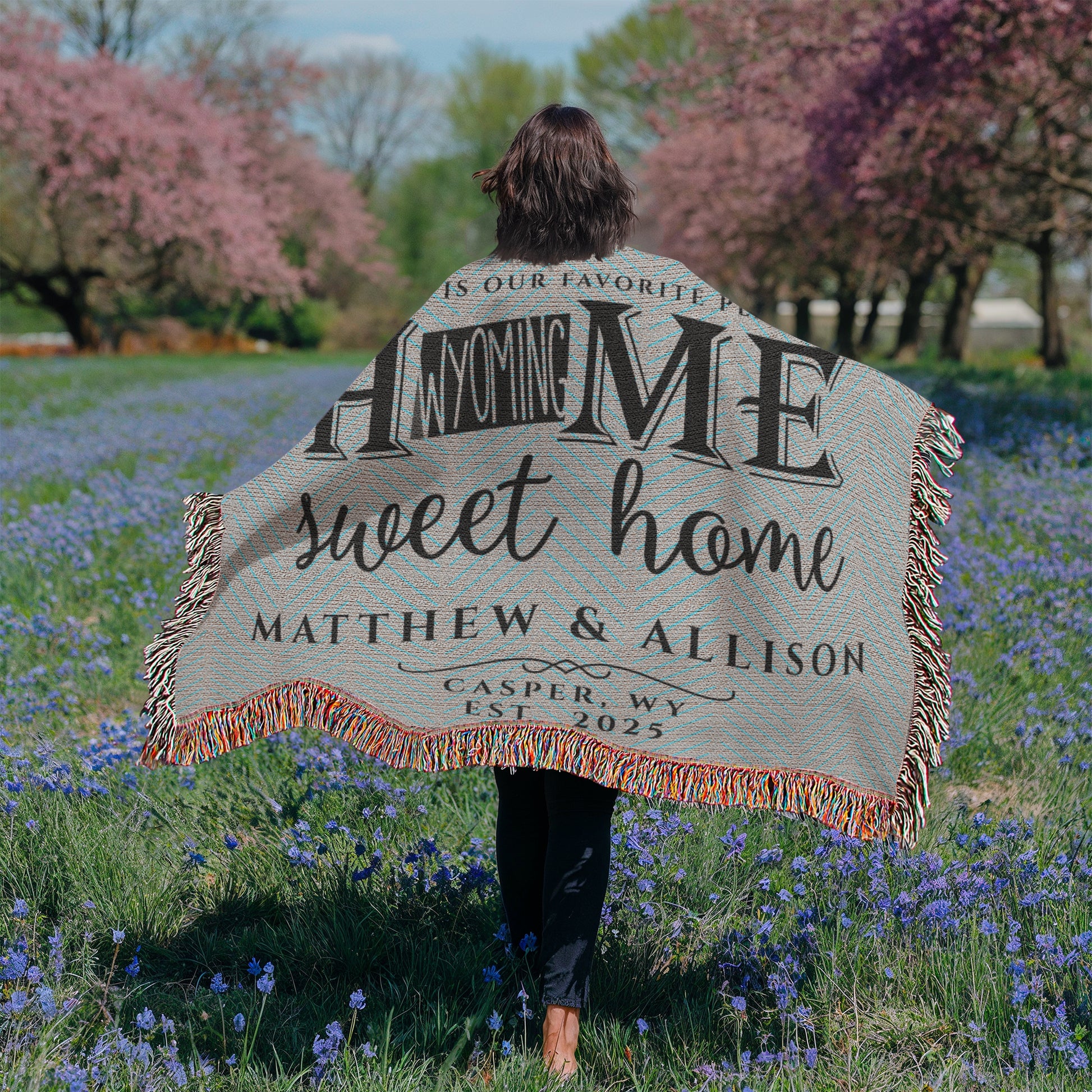 Celebrate life in the Cowboy State with this custom woven throw featuring Wyoming as the centerpiece of HOME. This personalized blanket is perfect for couples, families, or anyone proud to call Wyoming home, whether you're in the wide-open plains or near the Rocky Mountain foothills.